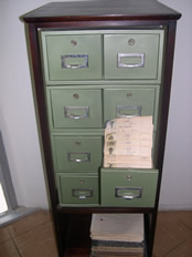Fichario em aço, com 8 gavetas, com fechaduras, embutido em móvel de madeira, confecção artesanal com linealidade sóbria e moderna. Mobiliário utilizado para arquivamento da ficha mod. 6, dos eleitores inscritos.