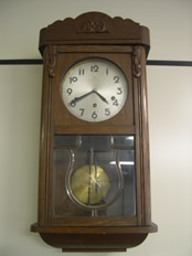Relógio de parede, embutido em móvel de madeira, com entalhe em “art noveau”. Marca: Junghans